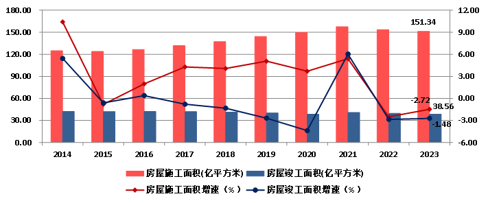 2023年,全国建筑业企业房屋建筑施工面积151.34亿平方米,比上年减少1.48%。房屋建筑竣工面积38.56亿平方米,比上年减少2.72%(图12)。