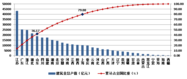 2023年,江苏建筑业总产值达到43140.15亿元,以绝对优势继续领跑全国。广东、浙江、湖北三省的建筑业总产值也都超过了2万亿元,分列第二、三、四位。4省建筑业总产值共占全国建筑业总产值的36.17%。除这4省外,总产值超过1万亿元的还有山东、四川、福建、湖南、北京、安徽、河南、江西、陕西、上海10个省市,上述14个地区完成的建筑业总产值占全国建筑业总产值的79.88%(图15)。