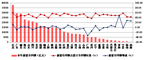 2023年,江苏建筑业企业新签合同额达到37800.49亿元,比上年增长12.1%。新签合同额超过2万亿元的还有广东、湖北、浙江、山东、四川等5个地区。新签合同额增速超过10%的有青海、海南、西藏、江苏等4个地区,14个地区新签合同额出现负增长,其中广西、贵州、新疆新签合同额均出现了超过10%的负增长(图20)。