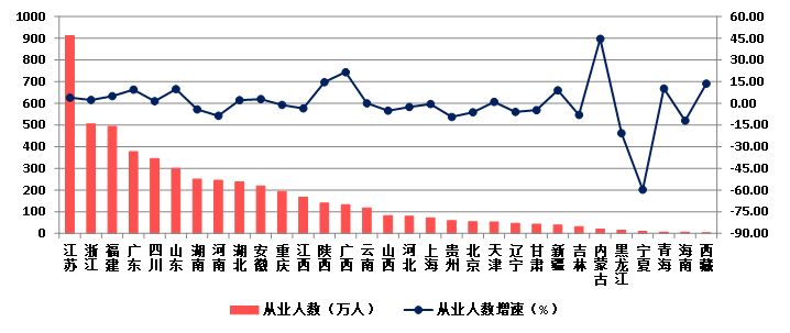 图22 2023年各地区建筑业从业人数及其增长情况
