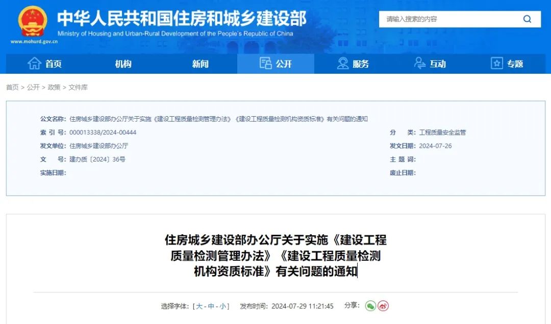 7月29日,住房城乡建设部办公厅发布关于实施《建设工程质量检测管理办法》《建设工程质量检测机构资质标准》有关问题的通知。通知提出:为保障建设工程质量检测新旧资质平稳过渡,新旧资质过渡期延长至2024年10月31日。
