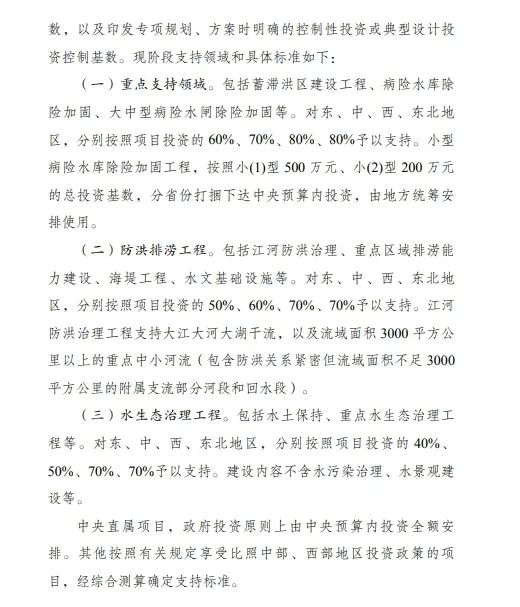 防洪排涝工程。包括江河防洪治理、重点区域排涝能力建设、海堤工程、水文基础设施等。对东、中、西、东北地区,分别按照项目投资的50%、60%、70%、70%予以支持。江河防洪治理工程支持大江大河大湖干流,以及流域面积3000平方公里以上的重点中小河流(包含防洪关系紧密但流域面积不足3000平方公里的附属支流部分河段和回水段)。
