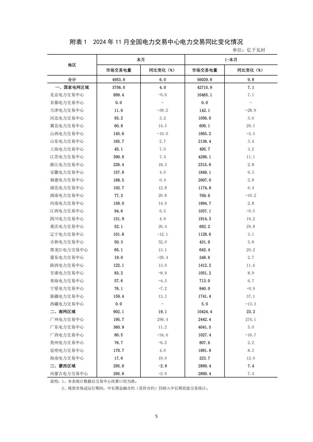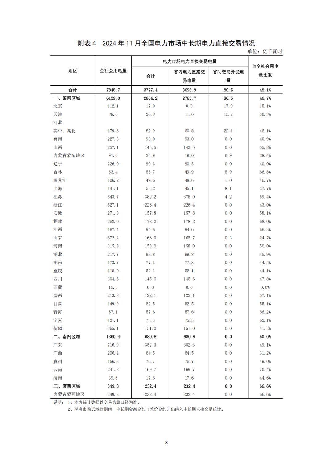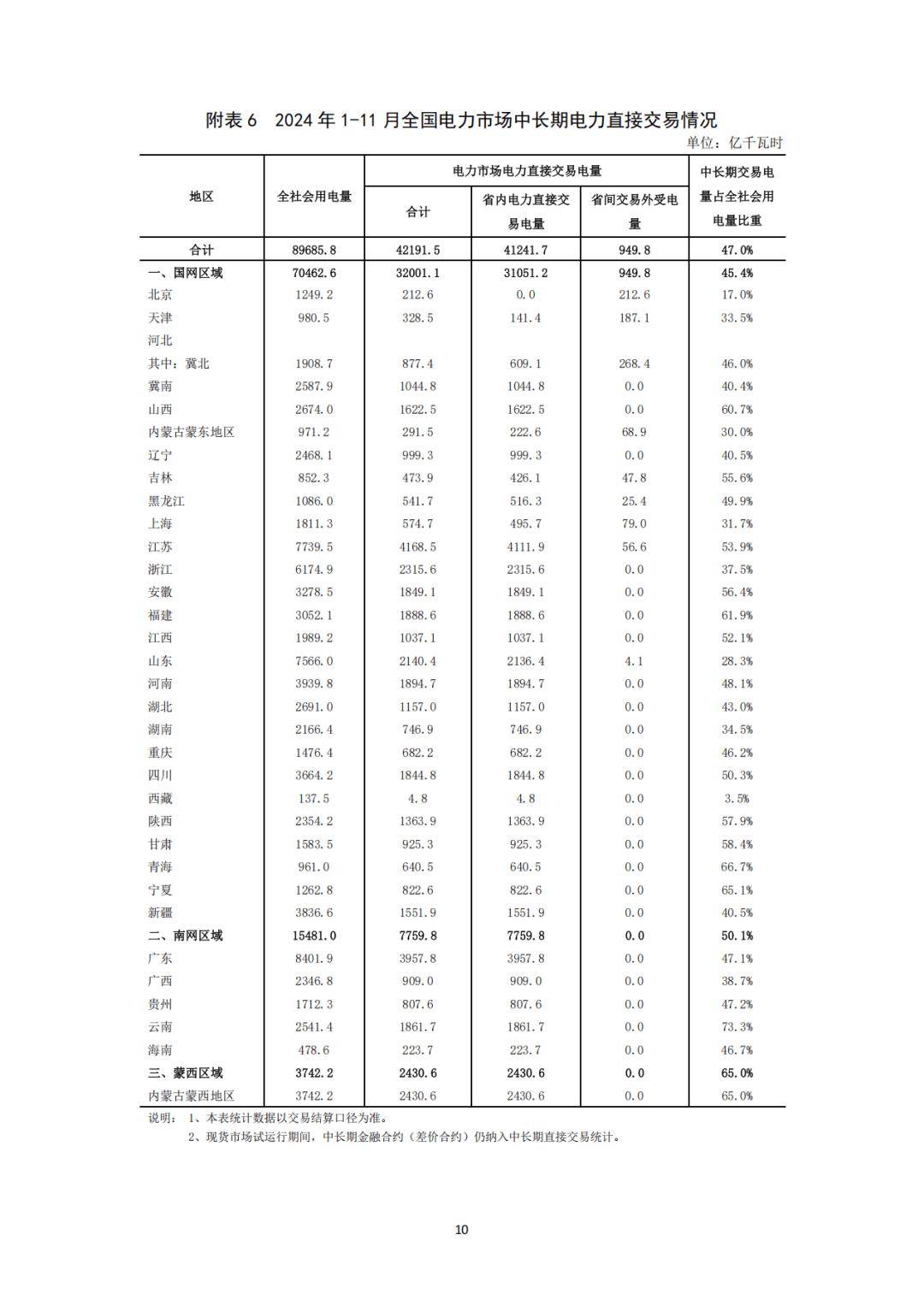 全国电力市场中长期电力直接交易中,1-11月,全国电力市场中长期电力直接交易电量合计为42191.5亿千瓦时,同比增长5.7%。其中,省内电力直接交易(含绿电、电网代购)电量合计为41241.7亿千瓦时,省间电力直接交易(外受)电量合计为949.8亿千瓦时。