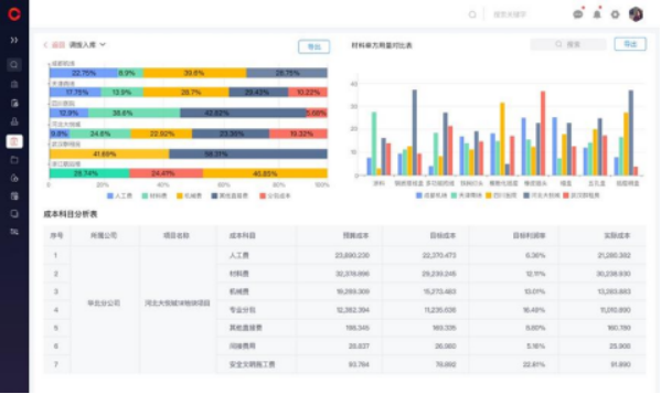 系统支持通过报表引擎横向对比不同项目的成本数据(如材料费用、机械效率);
