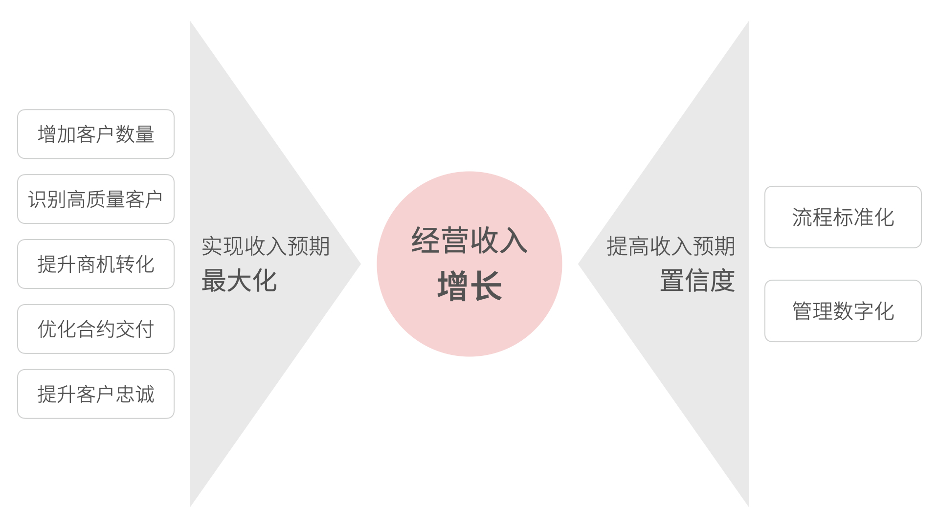 为了实现企业经营收入增长这个核心目标,CRM 软件需要企业实现收入预期最大化和提高收入预期置信度。实现收入预期最大化这个目标可以从五个方面入手:增加客户数量、识别高质量客户、提升商机转化、优化合约交付、提升客户忠诚。而提高收入预期置信度的本质是降低业务战略执行的不确定因素,从人治模式转型为系统管理,即流程标准化和管理数字化。