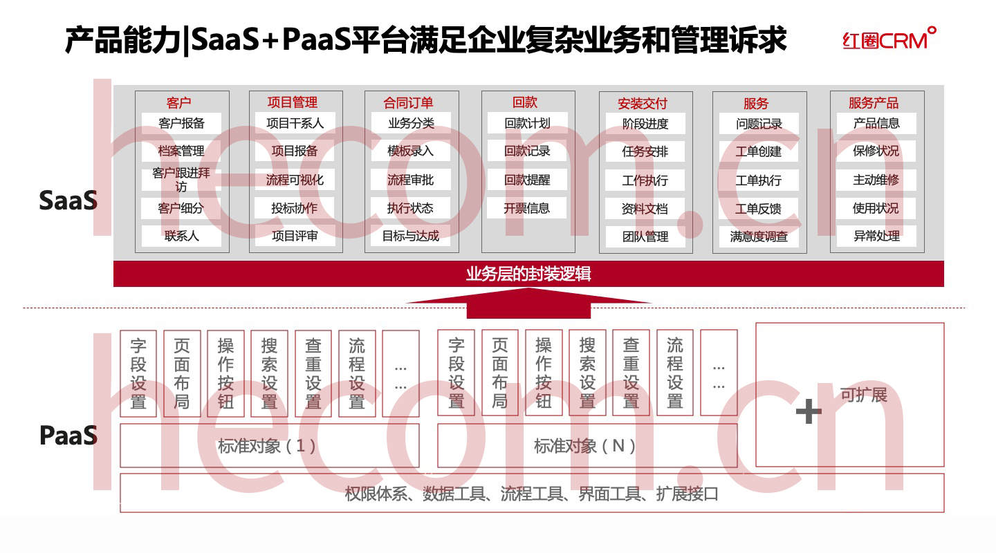 不同行业、不同类型的企业,其组织架构、管理方式和业务流程也不尽相同。而且,随着企业规模的不断扩大,客户关系管理的复杂度也在不断增加,企业的个性化诉求也会进一步增多。因此,单纯的SaaS软件已经不能完全适应客户的需求,在这种情况下,CRM的PaaS平台便应运而生了。