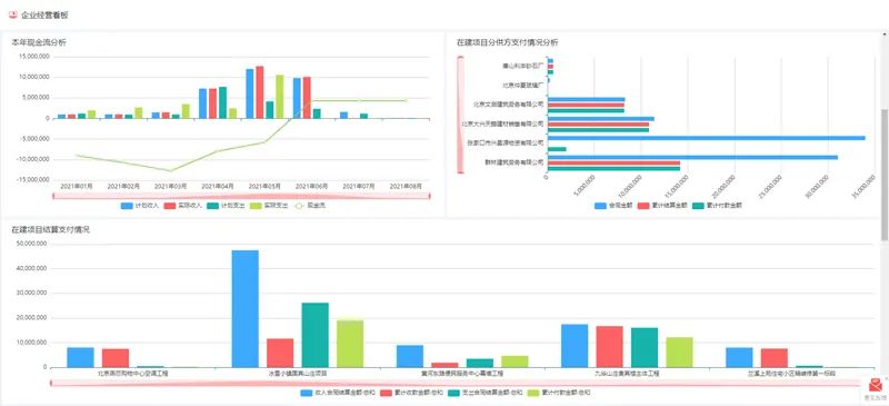 红圈系统为企业建立了多维度的经营数据可视化报表(包含合同金额/回款金额/开票金额/支付金额/动态利润金额等),通过精准详细的常规数据报表、曲线图报表、柱状图报表等多种展示形式,帮助管理层轻松掌握每一个关键数据,不受时间地点限制,可实时查看每个项目的经营情况。