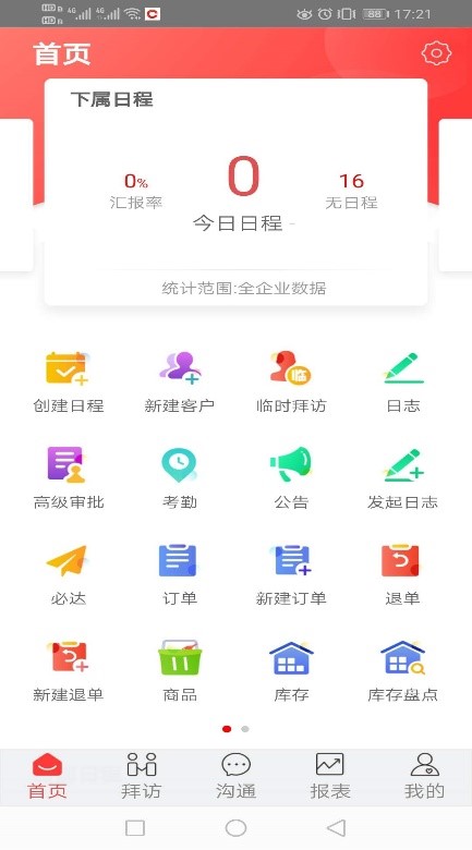 登陆后,下方为主要的操作按钮:首页、拜访、沟通、报表、我的。首页为主要的功能模块,可以通过右上角的设置(齿轮按钮)来进行模块调整;