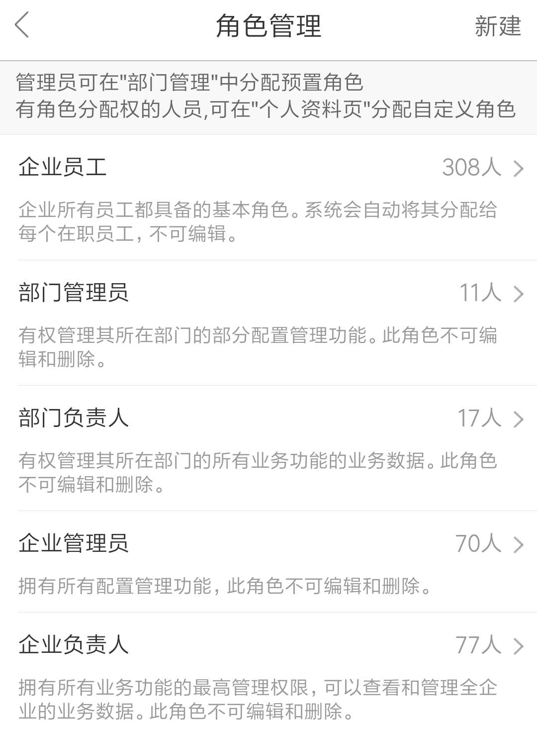在角色管理中,会默认有五种角色:企业负责人、企业管理员、部门负责人、部门管理员、企业员工。